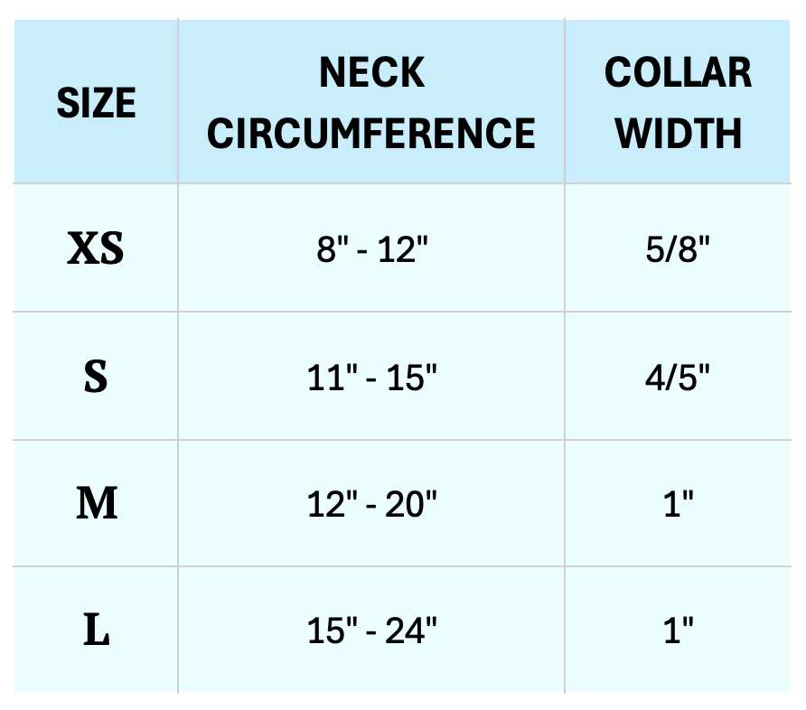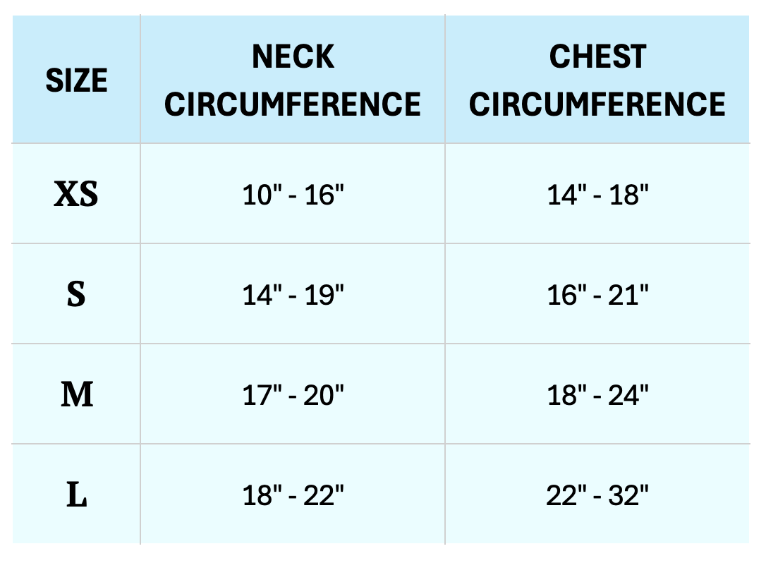 Measuring tips: If you're unsure of your dog's neck and chest size, use a soft measuring tape and wrap it around your dog's neck or the widest part of their chest (for harnesses). Make it snug but be sure 2-3 fingers can fit in between the measuring tape and your pup. If you don't have a soft measuring tape, take a string and wrap it around your dog's neck and chest. Then measure the length of the string.